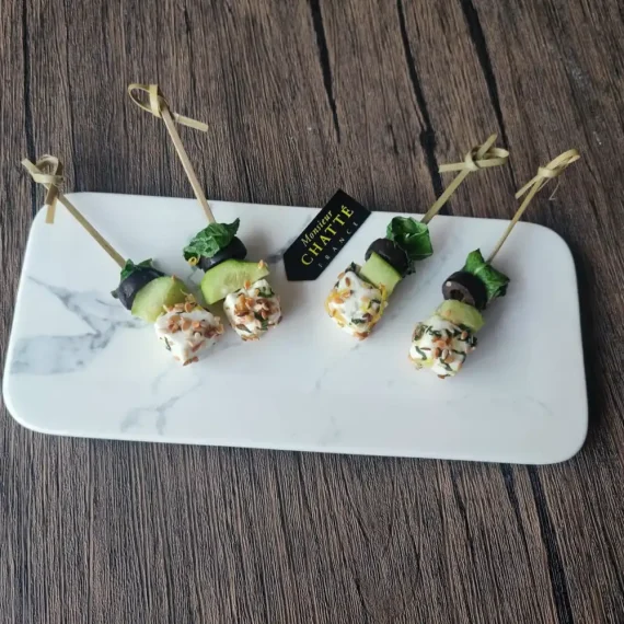 Herb Infused Seeds Feta Olives skewers by Monsieur CHATTE a tasty vegetarian gluten free option for your cocktail party.
